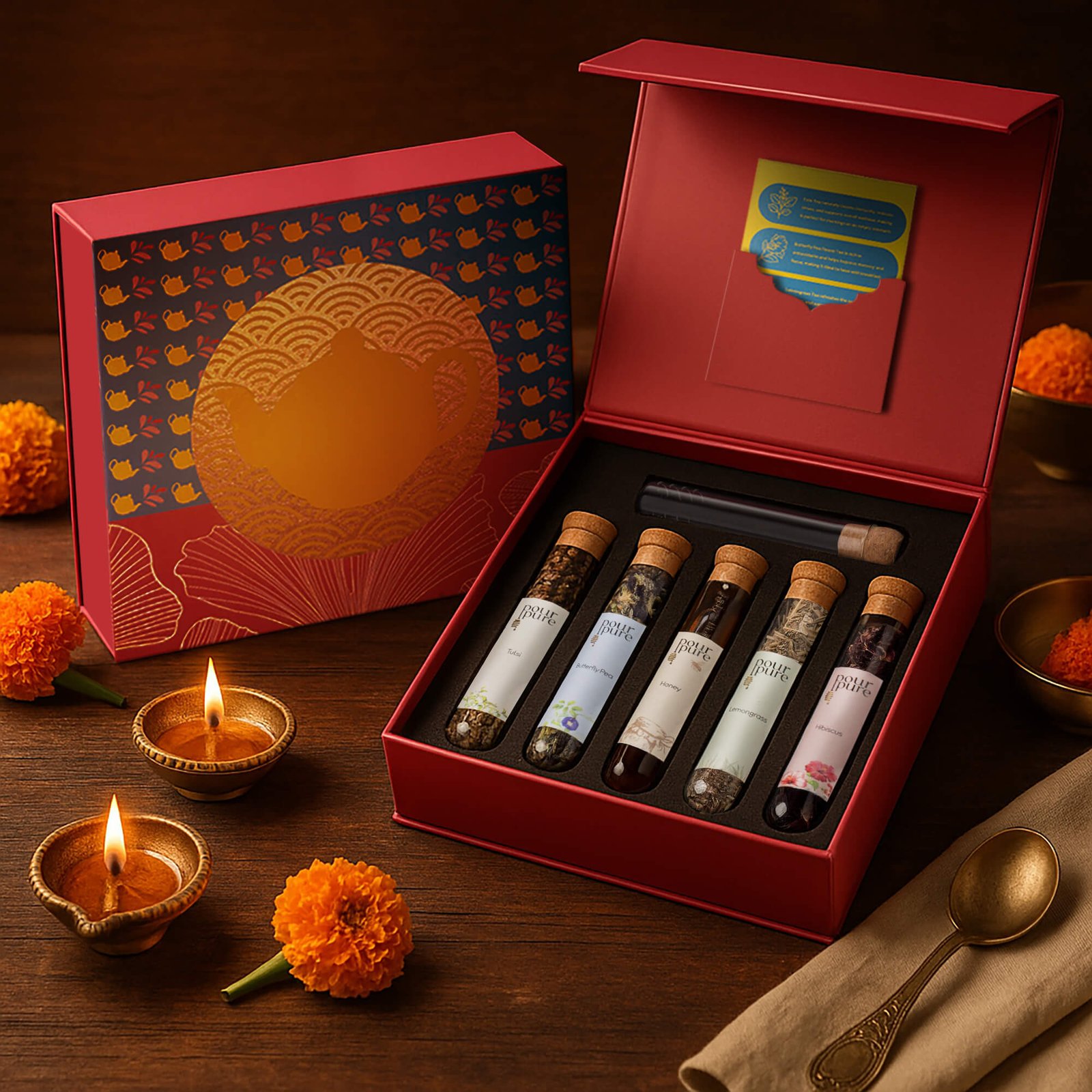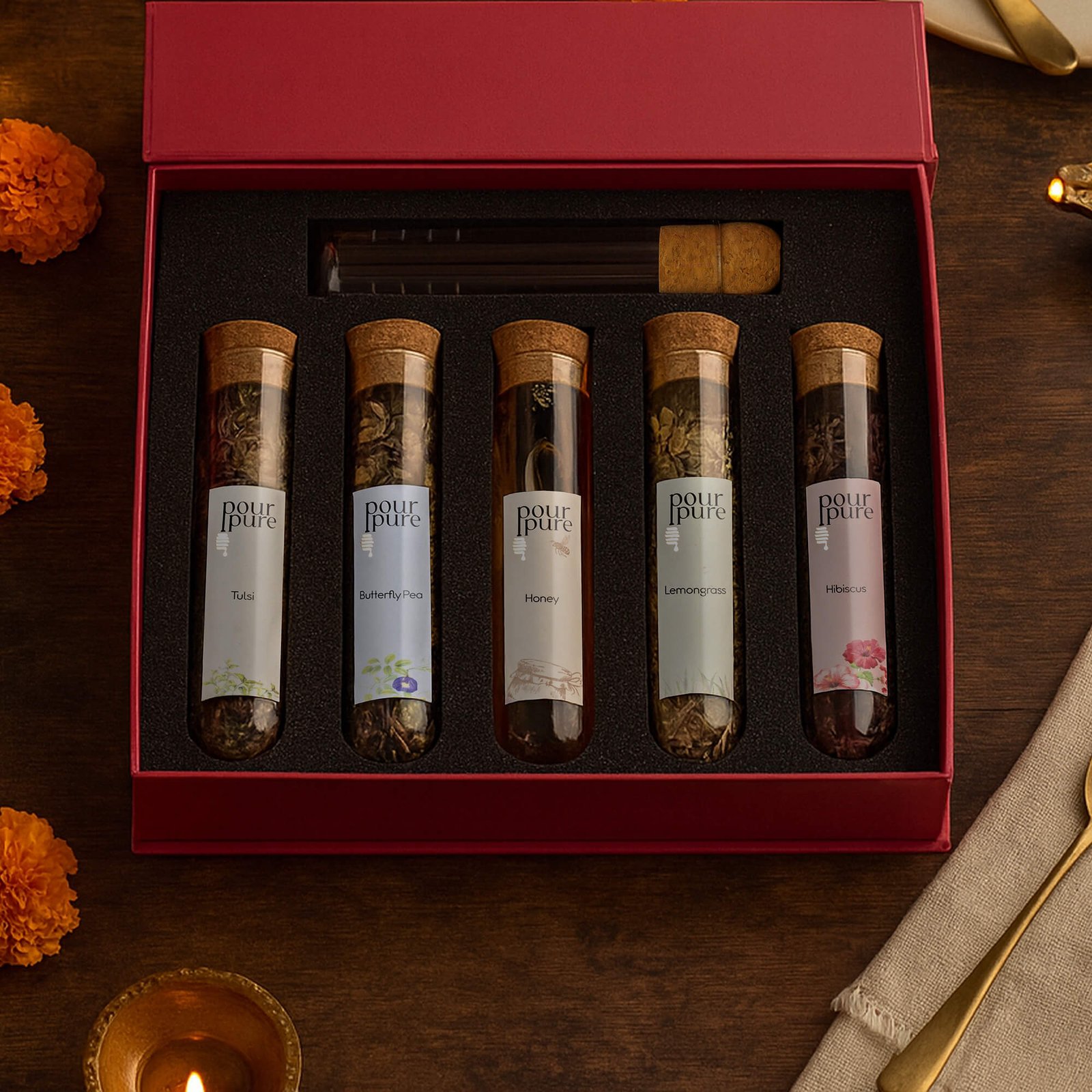 A curated set of Tulsi, Butterfly Pea Flower, Lemongrass, and Hibiscus dry leaves and petals, paired with farm-fresh honey and a premium infuser. Caffeine-free and rich in natural benefits, each brew brings balance, wellness, and comfort to your day.